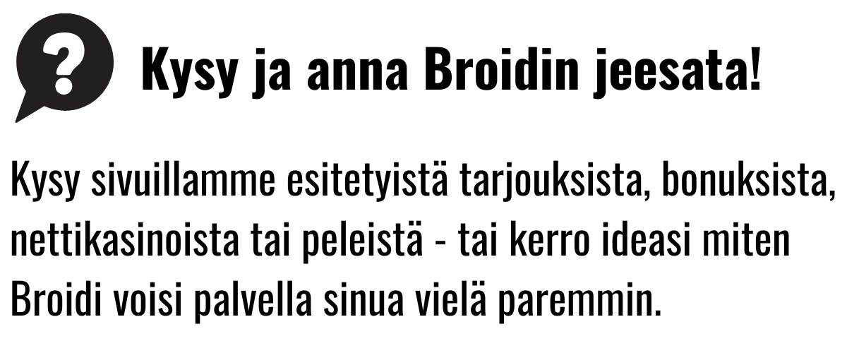 Broidin listoilta löydät takuulla parhaat, turvalliset ja luotettavat nettikasinot, pikakasinot sekä reiluimmat bonukset ja kierrätysvapaat ilmaiskierrokset.