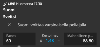 - Lyö koko summa Suomen voitolle kertoimella 1.48*