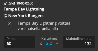 - Jos Tampa voittaa, sinä voitat 132 euroa!