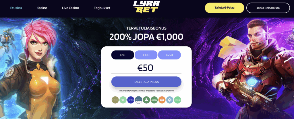 LyraBet ei pihtaile bonuksissa. Heti ensitalletuksella nappaat 200 % bonuksen jopa 1 000 € asti – eli kolminkertaistat pelirahasi ensimmäisellä talletuksella! Tarjolla on myös paljon vaihtuvia kampanjoita.